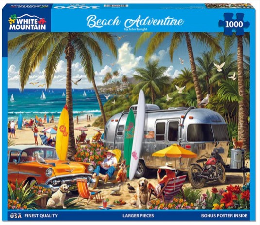You know summer has arrive when the campers hit the beach. All you need is your chairs, surf boards, and furry friends to make the most out of your long summer days. Artist John Enright has everything a Beach Adventures needs, including the Airstream, in this 1000 piece jigsaw puzzle.