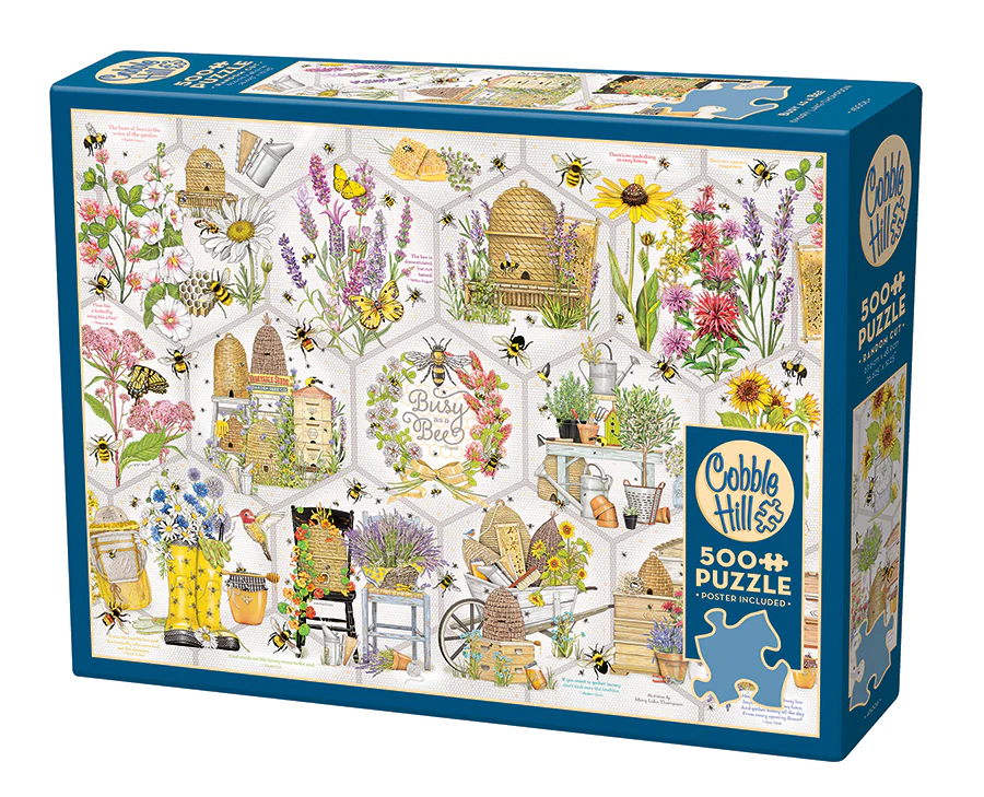 If you’re a gardener, bee lover, or fan of puzzle collages, then you’ll keep as Busy as a Bee with this fun 500 piece puzzle all about the buzzed life. Fun quotes and facts are sprinkled throughout the flowers and garden accessories all against a beehive background.