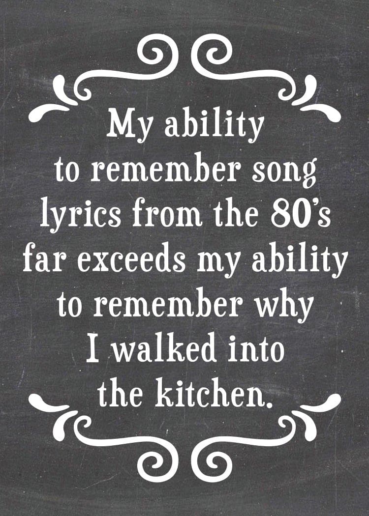 ” My ability to remember song lyrics from the 80’s far exceeds my ability to remember why I walked into the kitchen.”