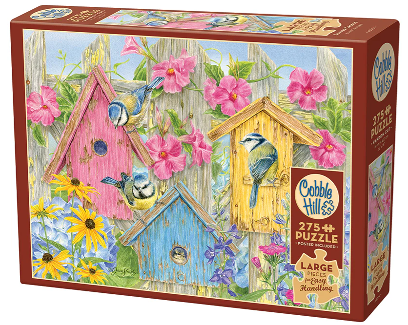 A pastel pink, blue, and yellow birdhouse are home to the cutest birds. They love when the flowers are in bloom and gather together to share their latest chirpings.